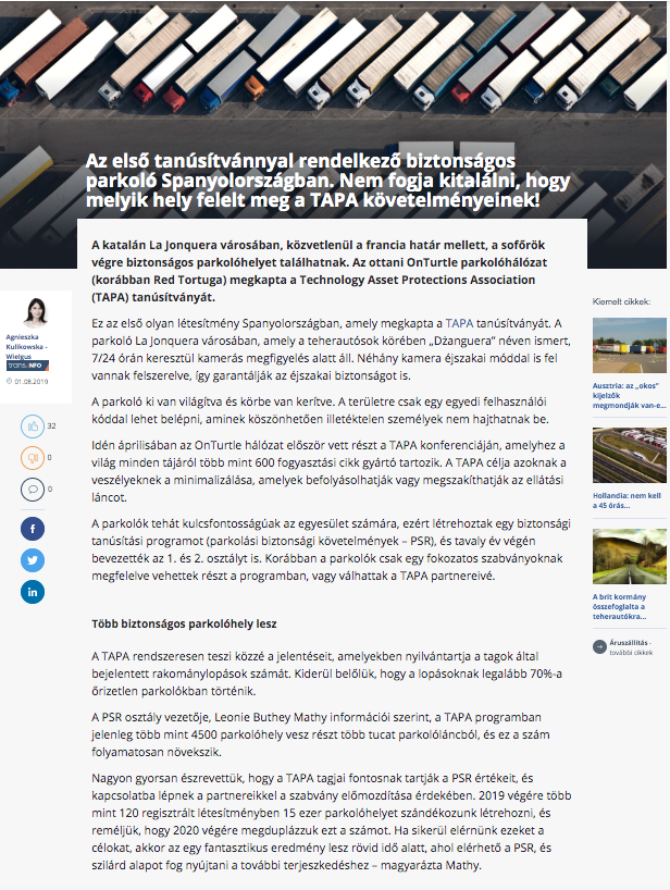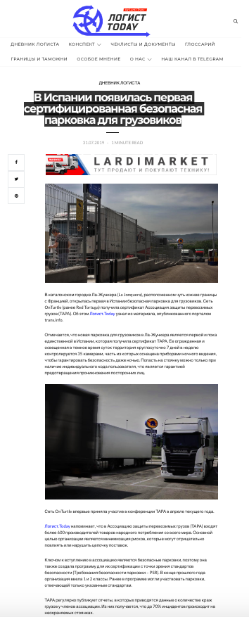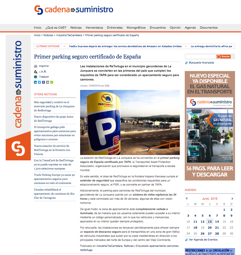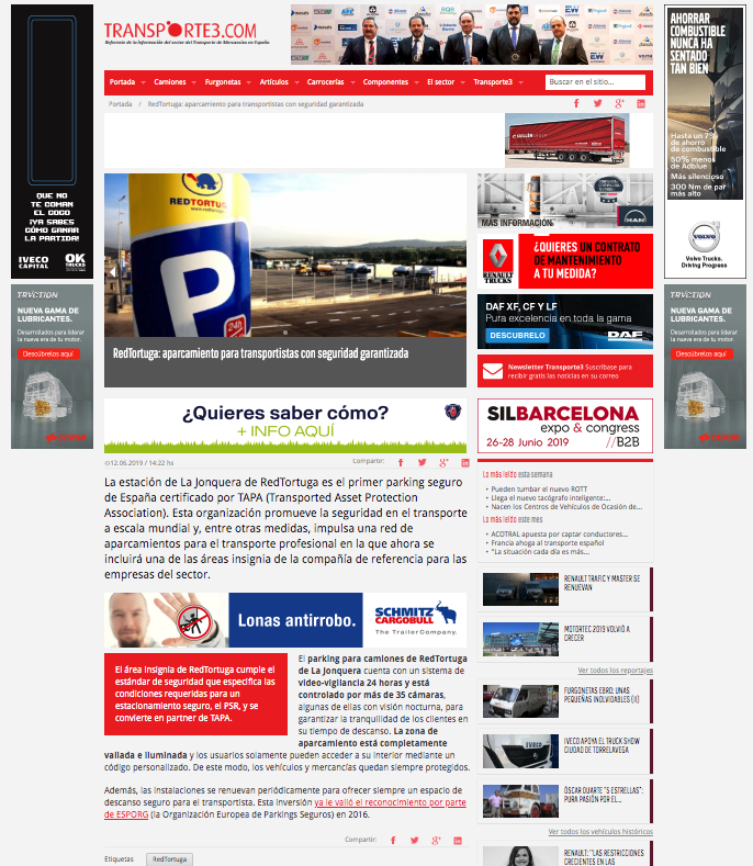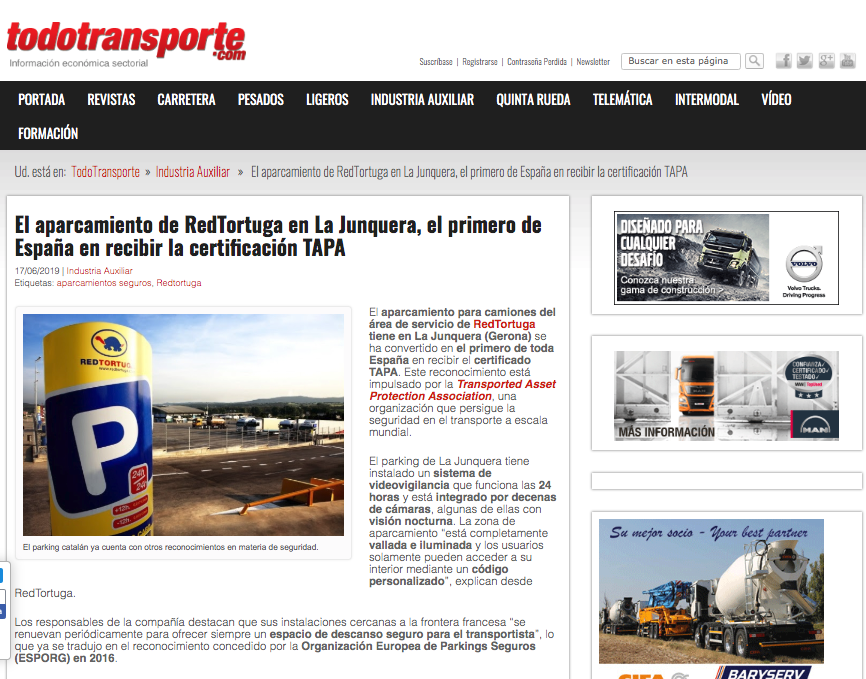Nuestro parking de La Jonquera ya forma parte de la Transported Asset Protection Association (TAPA), la organización mundial que defiende un transporte rentable y seguro. La entidad reúne a los principales fabricantes, proveedores y autoridades del mundo de la logística y el transporte profesional, y nos enorgullece ser sus primeros partners en España. Una noticia que ha conseguido un gran impacto en medios de comunicación de toda Europa. ¡Siempre fieles a nuestro compromiso con la seguridad!